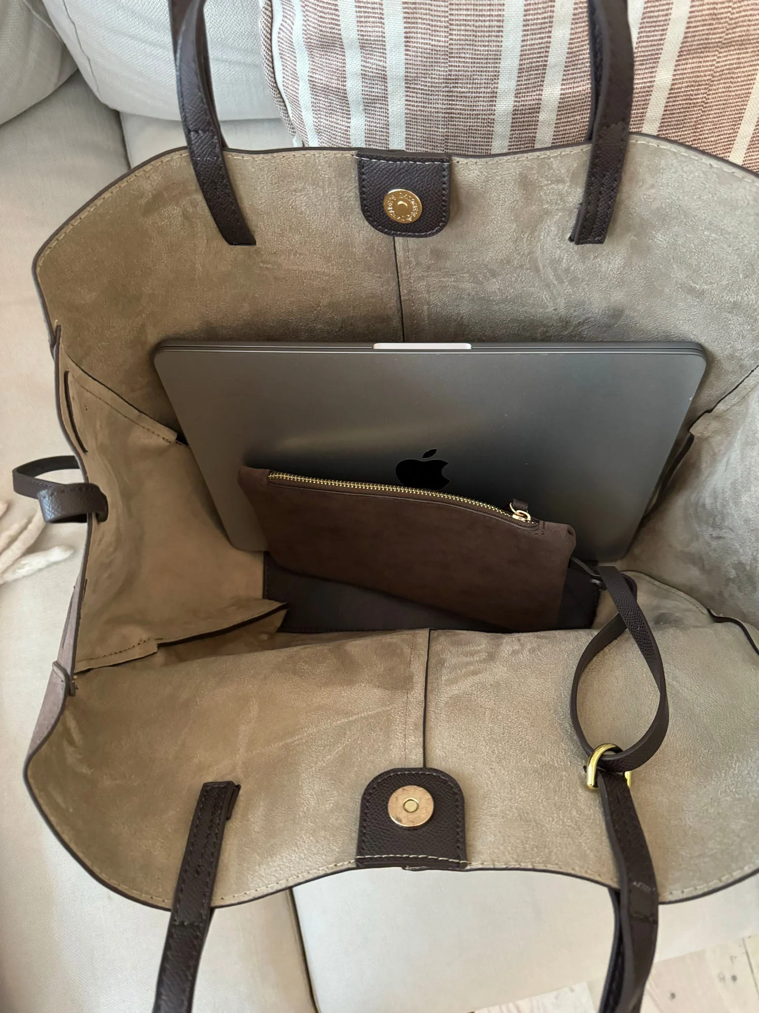 This spacious shoulder bag in brown suede with leather-look details/straps combines luxury and functionality in the best way. The bag offers ample space for all your essentials, including a 13-inch MacBook, making it perfect for work, school, and leisure. The suede-look material gives the bag a modern touch, while the details add a stylish and contemporary flair. Its practical size and timeless design make it ideal for both everyday use and as a travel bag, carrying everything you need. The brown and black color combination ensures the bag is versatile and easy to style with any wardrobe.