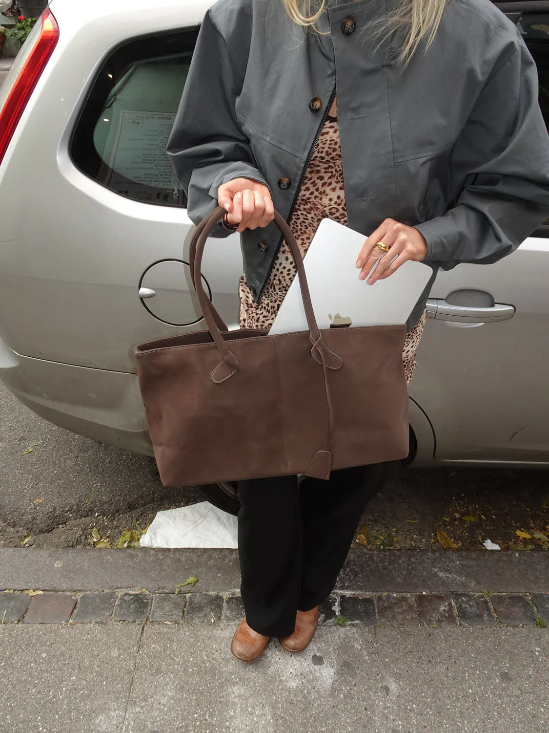 Solero is an elegant and spacious handbag in brown vegan suede, combining a minimalist look with a luxurious feel. Its simple shape and soft lines make it a versatile piece you can use for work, shopping, or everyday life. A timeless classic that elevates any outfit.