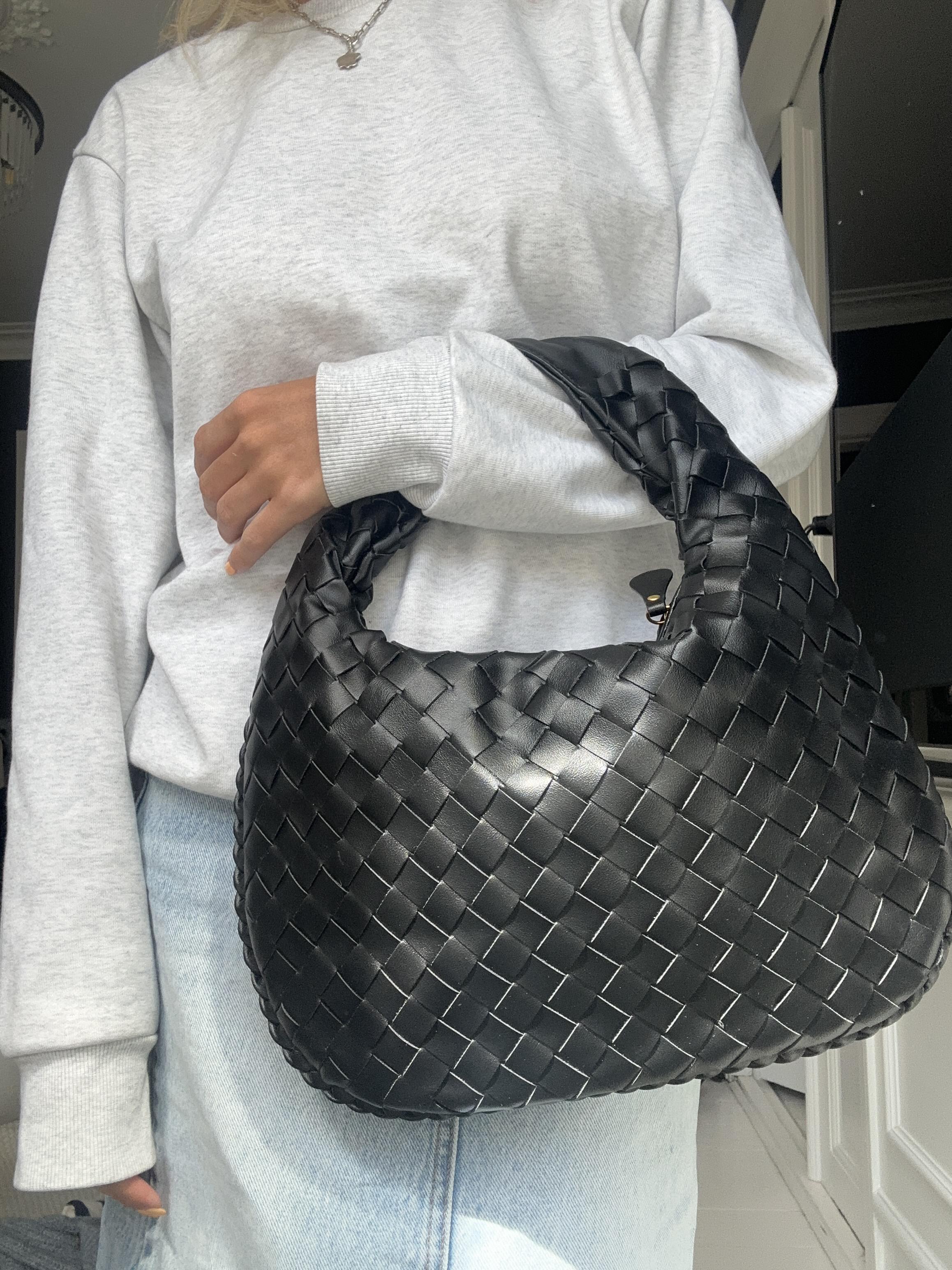 Our Paris shoulder bag has a round shape and a woven/braided design. The bag has a large main compartment with zip closure, and two smaller compartments with zip inside the bag and a small open pocket.