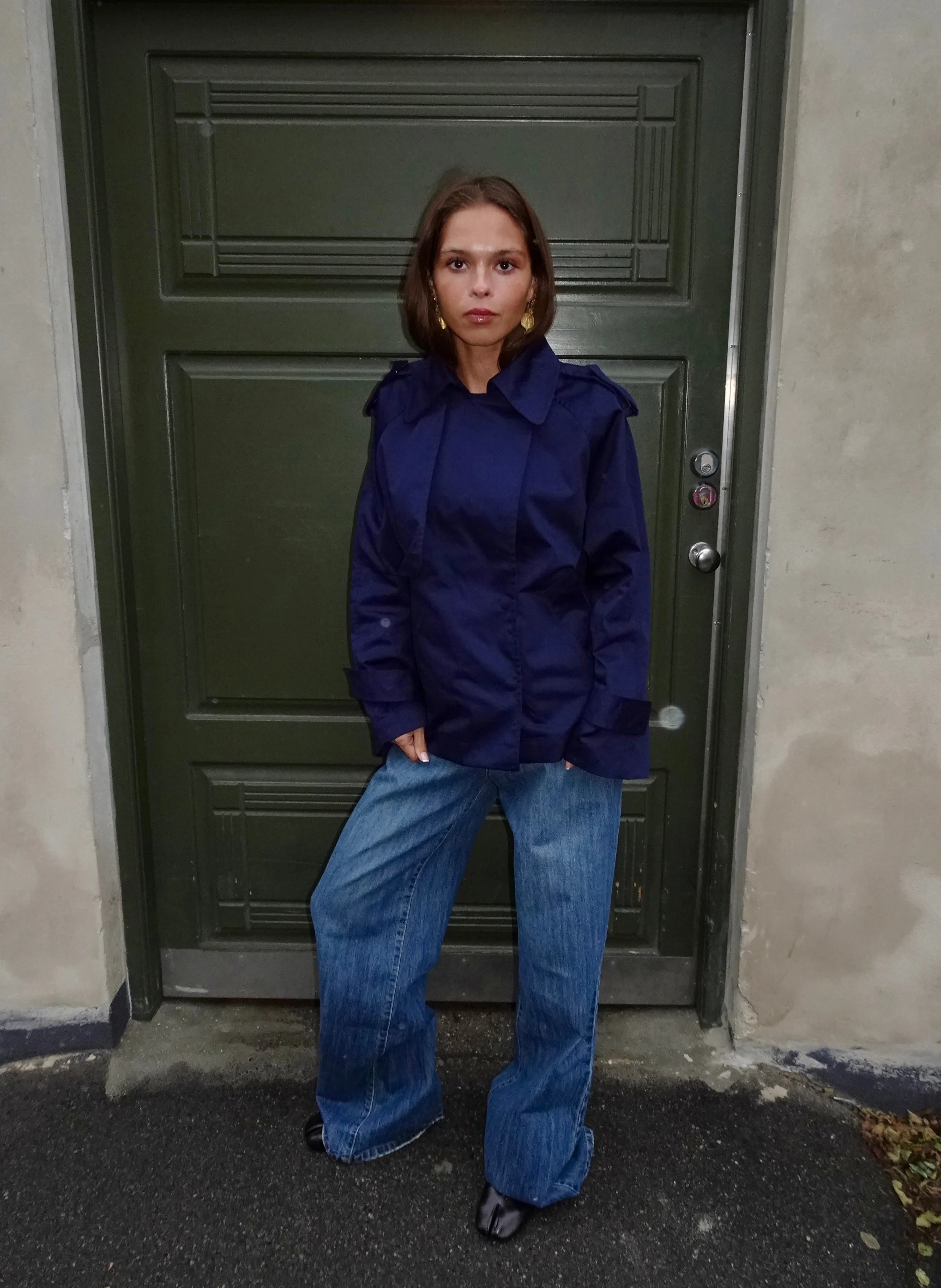 This shorter trench coat in elegant navy is a refined choice for anyone seeking a combination of classic design elements and a modern, relaxed expression. The coat is made from a lightweight woven material, making it comfortable to wear throughout the seasons.