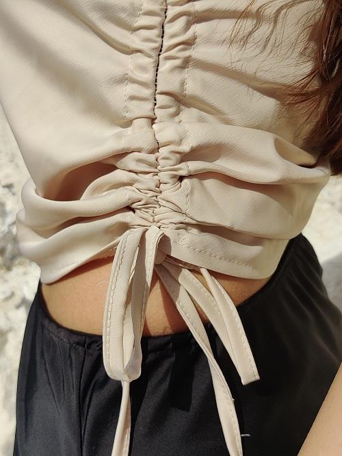 Naomi satin top with drawstring at the side that can be tied,