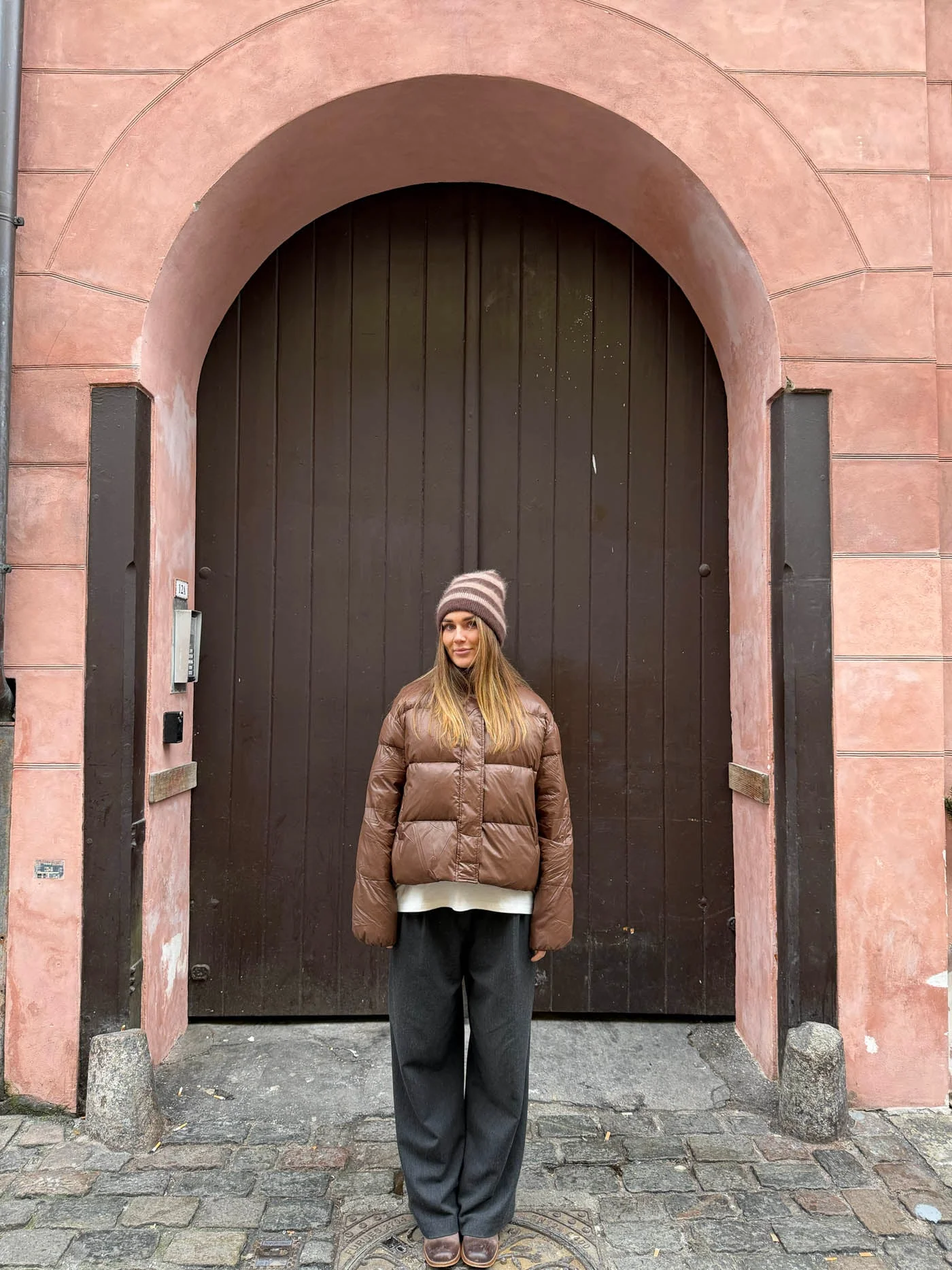 Elin is a warm and stylish bomber down jacket in a deep dark brown shade. The jacket features a modern, puffer-style look with a classic bomber cut, offering both comfort and a trendy appearance. It is ideal for the colder months and easy to style over both casual and more elegant outfits.