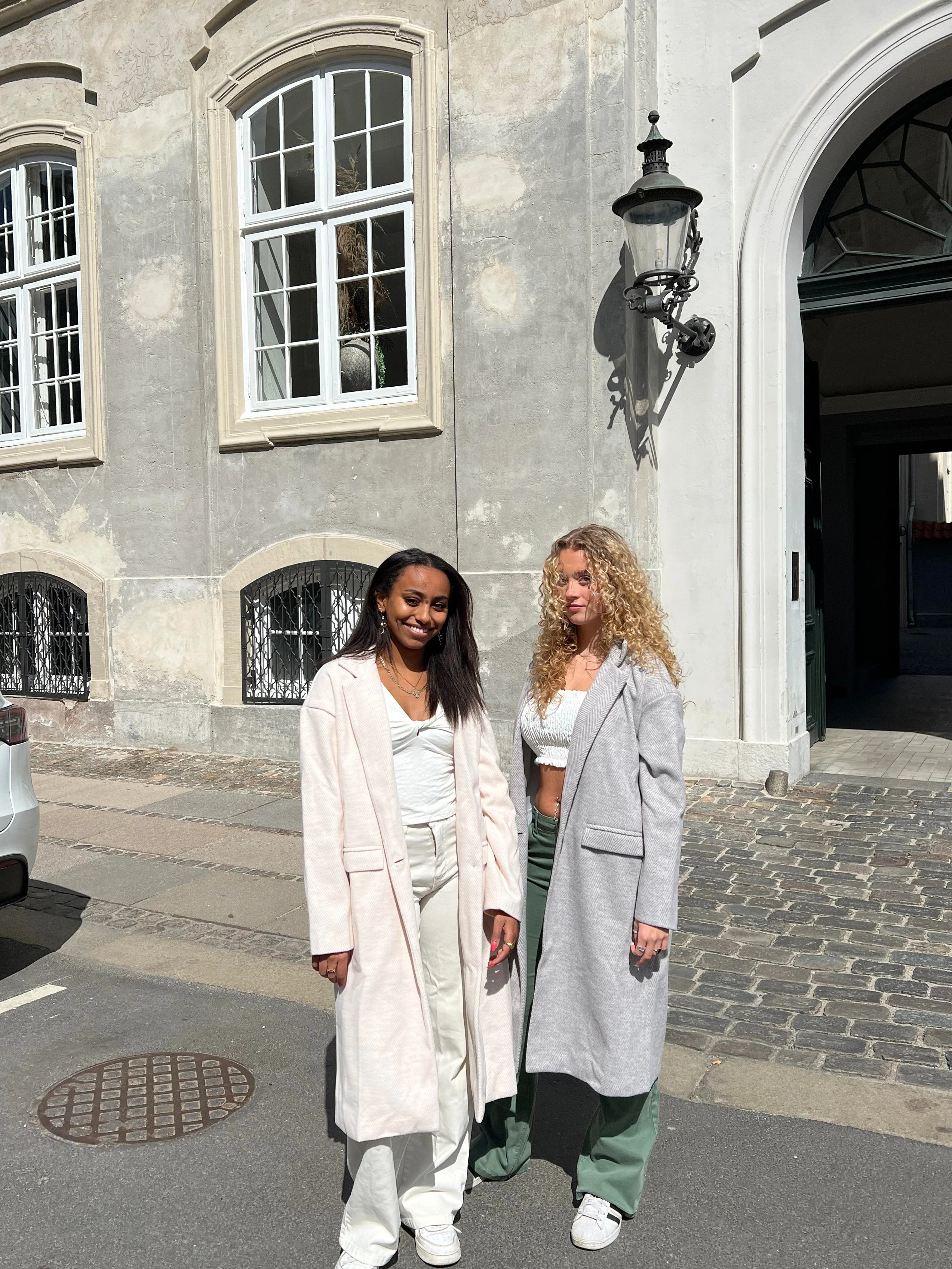 Paisley coat closes in fromt with a button and has two fake pockets in front. The coat has an off white/white pattern