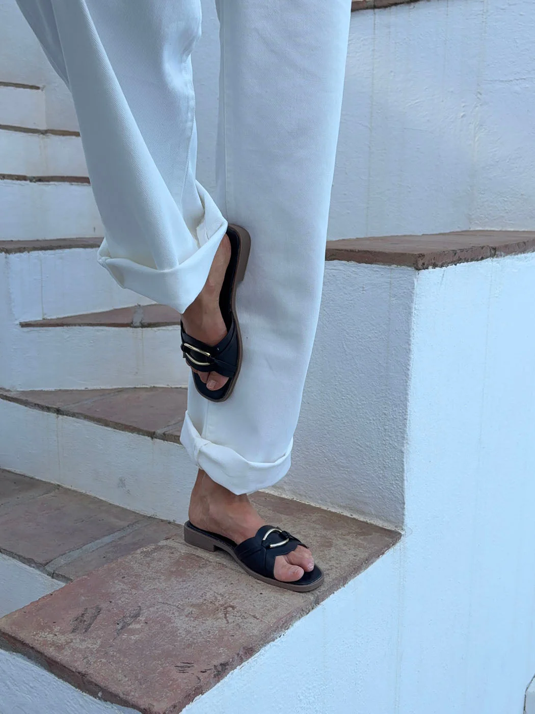 These black sandals with gold detailing combine classic minimalism with an exclusive touch. The wide strap is adorned with an elegant gold-colored ring, adding a sophisticated and modern element to the simple design.