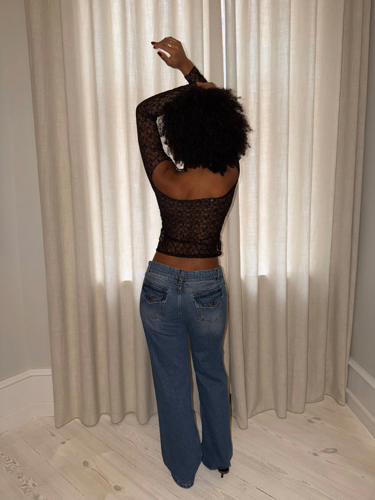 Black lace blouse in off-shoulder. The top has an extra layer of lace on the chest, so it´s less see-through.
