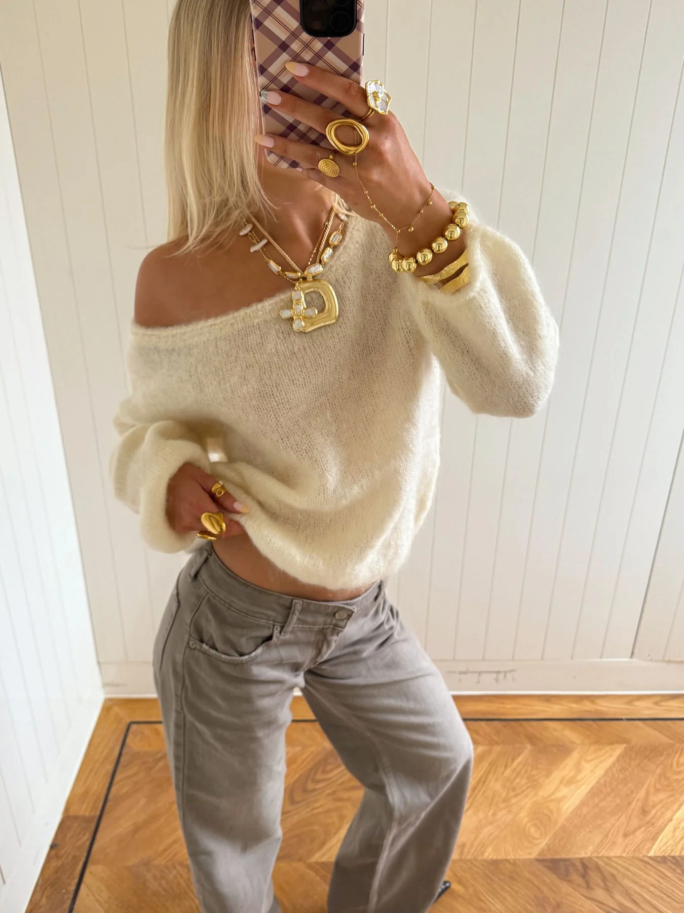 This soft and fluffy off-shoulder knit sweater gives a feminine and effortless look. The slightly loose fit drapes beautifully over the body, while the wide neckline makes it possible to style the sweater asymmetrically — perfect off one shoulder. The fine, cream-coloured shade makes it easy to combine with both jeans, skirts, and elegant trousers.