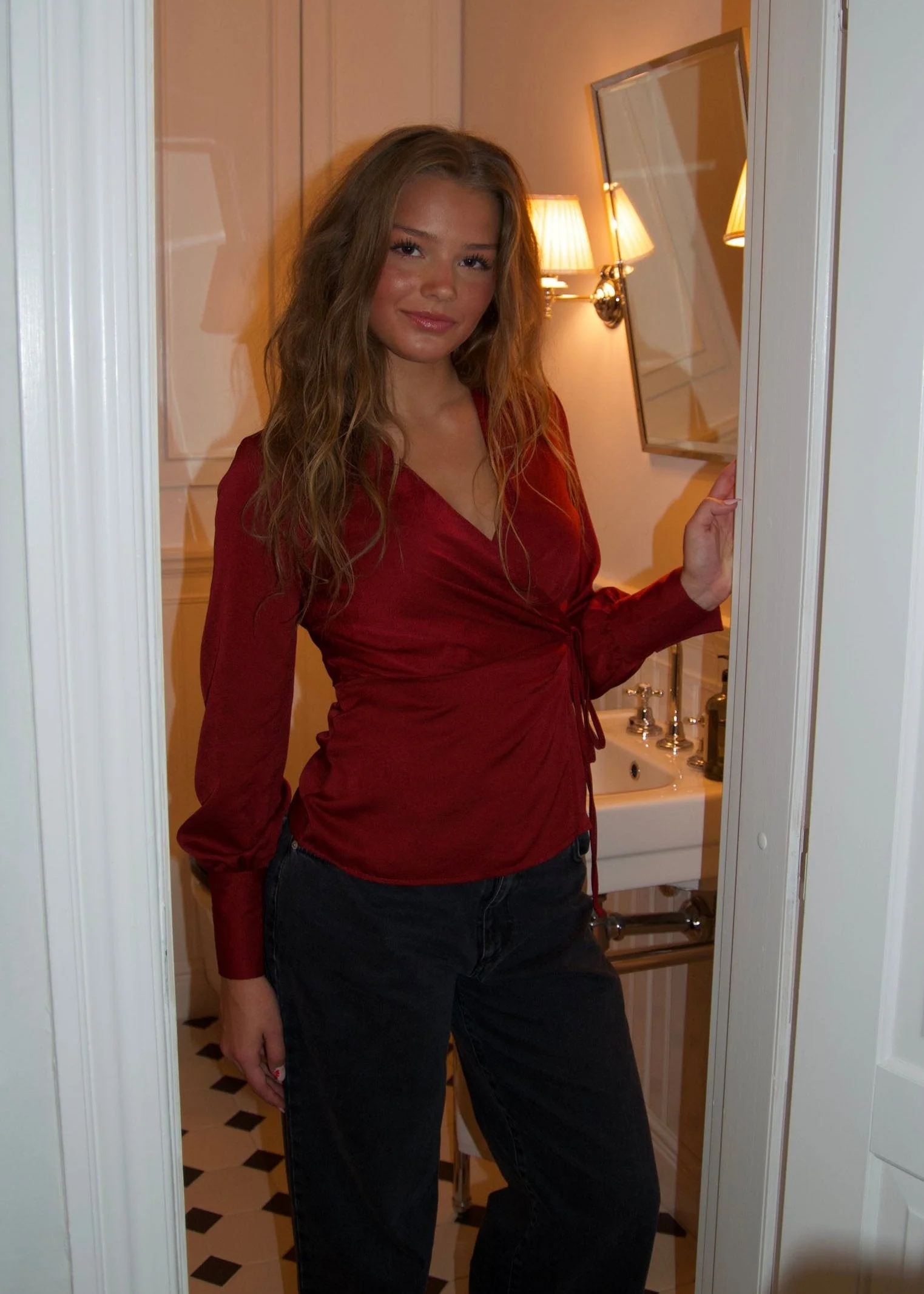 This red blouse with a waist tie is both feminine and versatile. The tie creates a deep V-neckline that beautifully accentuates the waist while giving the blouse an airy, adjustable fit. The relaxed loose fit and trendy balloon sleeves, which gather at the wrists with a tighter cuff, add a modern and sophisticated touch. Perfect for both everyday wear and festive occasions, this blouse offers a stylish and flattering look that can easily be dressed up or down.