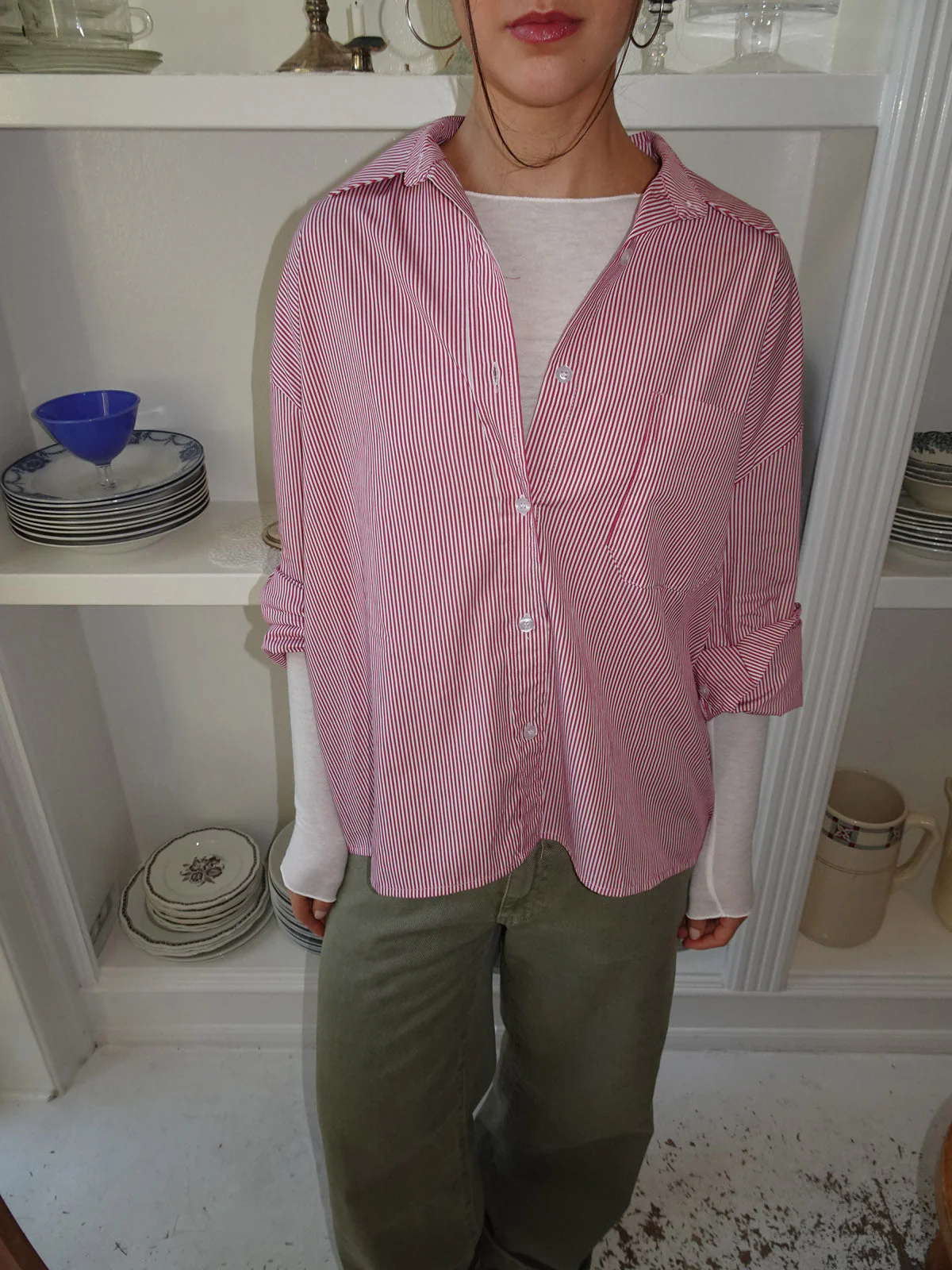 The perfect shirt with red and white stripes, which is perfect for all seasons. It is stylish and goes with everything in the wardrobe! It has a loose and relaxed look and closes with buttons at the front. The shirt has a slit at the back.